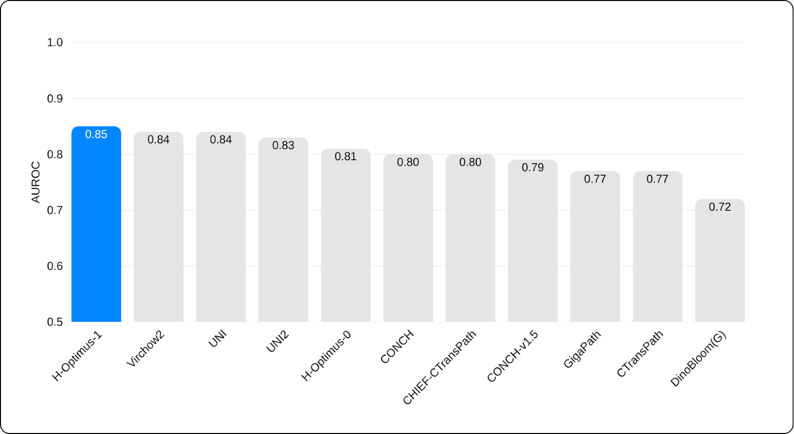 The team tested 11 state-of-the-art FMs, including H-Optimus-1, which emerged as one of the strongest backbones across both the internal and the external cohorts. On the validation, H-Optimus-1 achieved top place with an AUROC of 0.85. This indicates the system has the ability to classify patients by predicted risk, from the biopsy images alone. Furthermore, it also generalizes across datasets and institutions, a critical property for any model intended for real-world deployment.