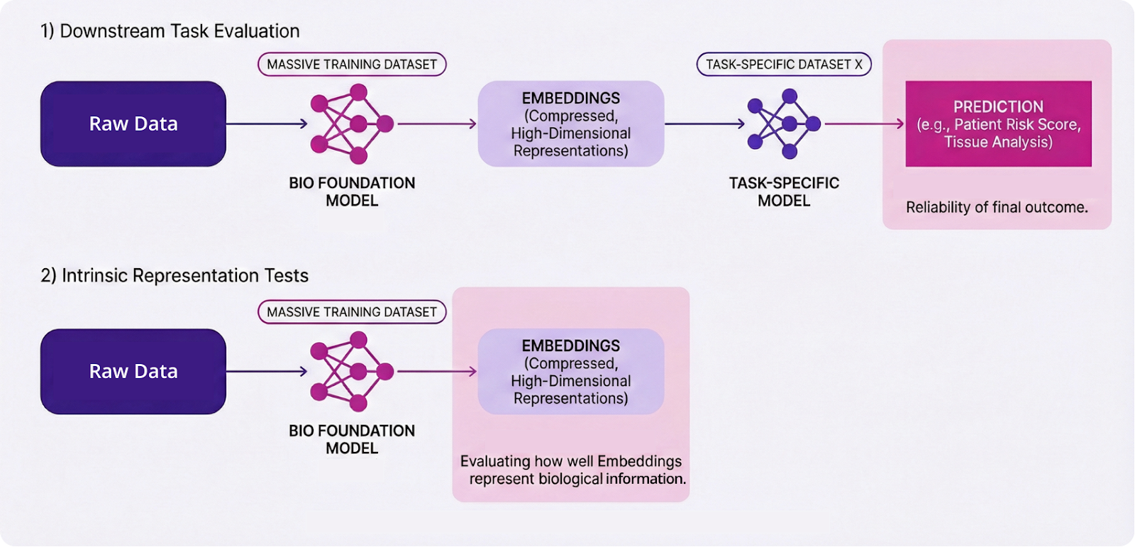 While these technical evaluations are essential, they are ultimately proxies designed to answer one central question: Do the model's predictions hold up against experimental and clinical reality? The role of Bio FMs as general-purpose backbones means that no single metric can fully capture their utility; a rigorous assessment must combine downstream task benchmarks with intrinsic representation tests.