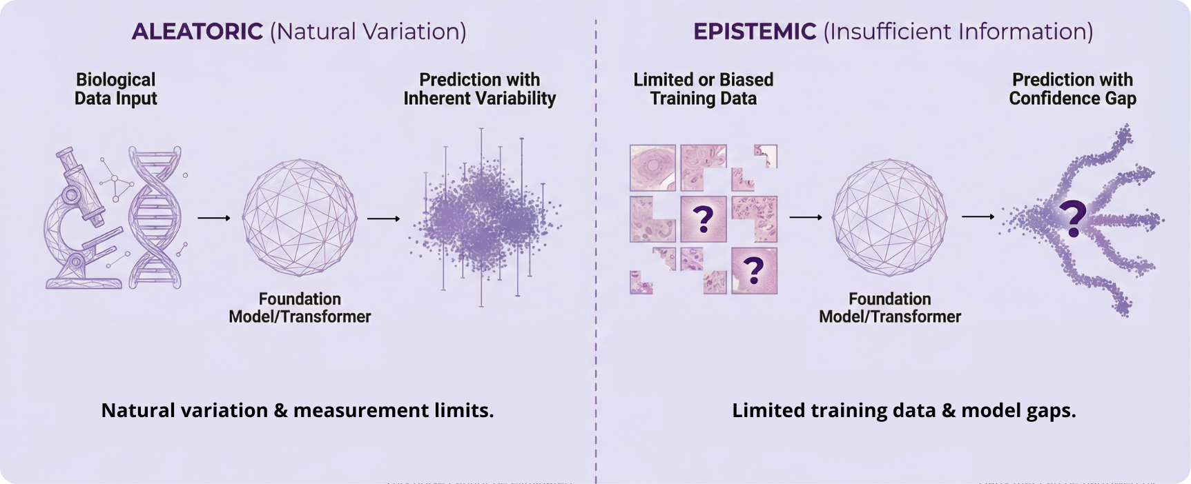 One way to achieve this is by moving beyond accuracy measurements to include explicit uncertainty quantification, distinguishing between aleatoric uncertainty (the inherent stochastic noise in biological data) and epistemic uncertainty (due to lack of data & gaps in knowledge).